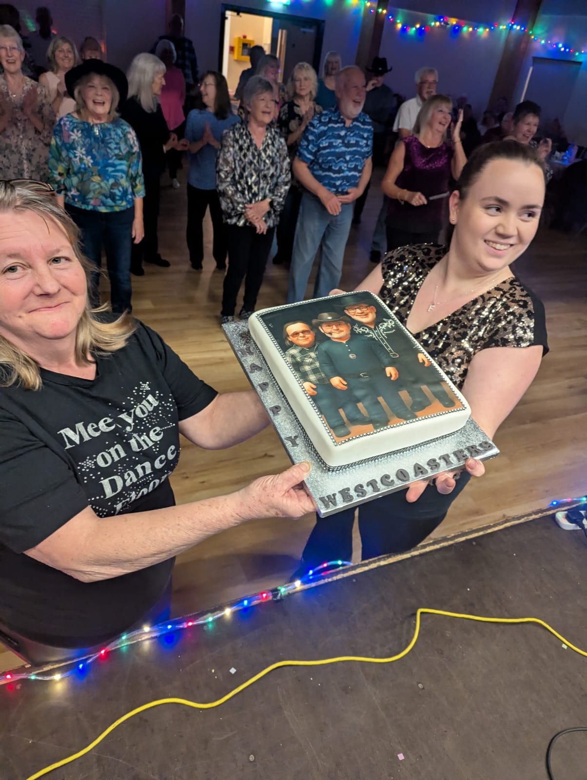 Prior to the second set starting Jenny presented The Westcoasters with a cake baked by Dixie Belles Caterer Extraordinaire Sue Weston, featuring a picture of the boys in the band. If it was as good as the lemon drizzle sponge that we all received just before the raffle then the lads will have had a fulfilling late night in every meaning! The second set kept the party atmosphere pulsating as the band swept through another mix of excellent dance numbers featuring among others Folsom Prison Blues (Cowboy Charleston), Nothing But The Taillights (Accidentally On Purpose), Tonight's The Heartache's On Me (Heartbreak Express) and Whiskey Under The Bridge (Whiskey Bridges). This left many dancers breathless so the raffle served to keep the atmosphere from boiling over. |